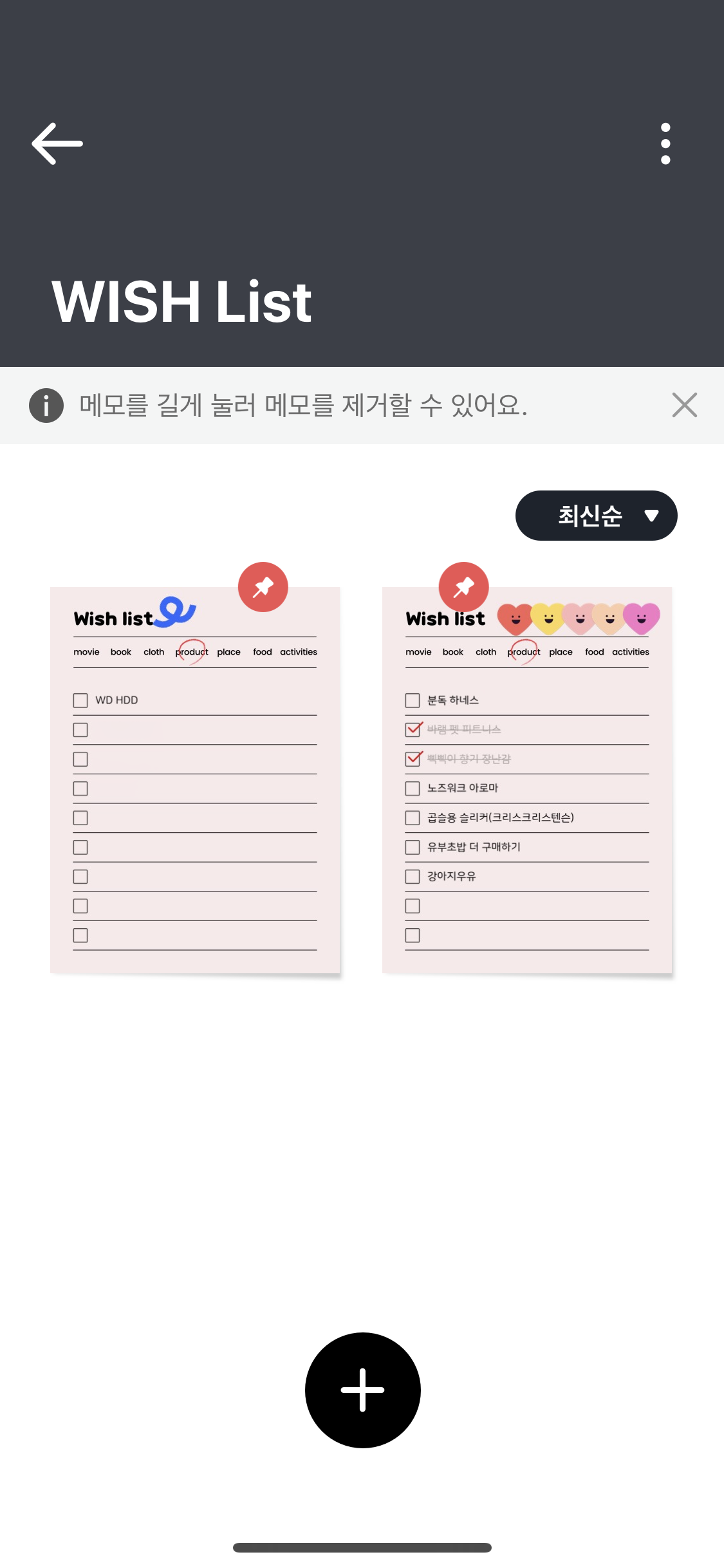 메인 화면의 + 버튼을 누르면 메모를 추가할 수 있다. 예전과 달리 한눈에 메모지들을 볼 수 있게 바뀐 모습.