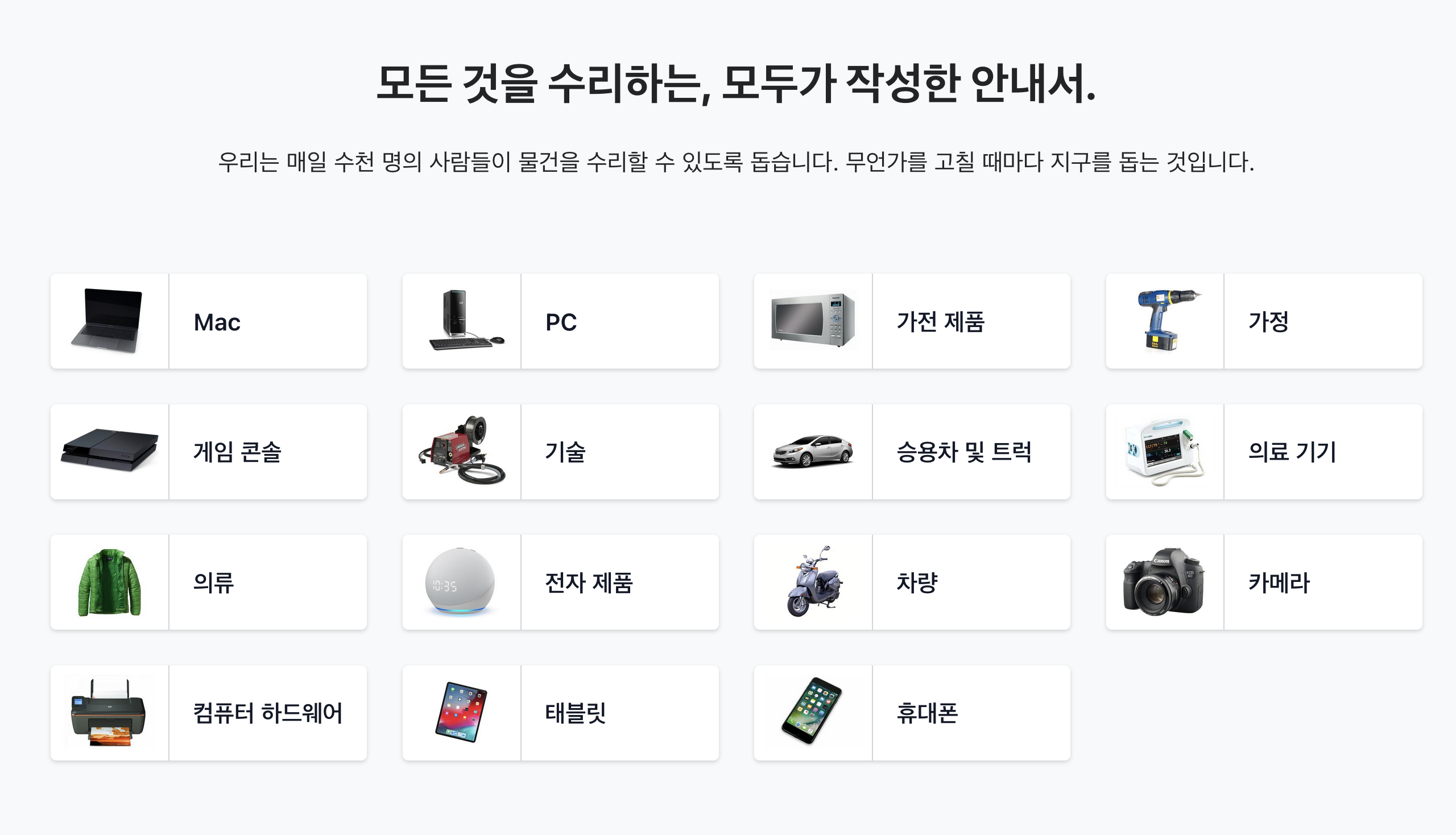 n년 전 자가 수리의 영역이 한창 궁금했을 때 검색해 보다가 알게 된 사이트. 해외배송이 귀찮아서 결국 이용하진 않았다. 글 쓰려고 다시 접속해 보니 이전보다 훨씬 다양한 언어를 지원하고 있고 설명서를 제공하고 있는 제품도 매우 다양해졌다. 한국어 지원도 되긴 하지만 메뉴만 일부 한국어가 적용될 뿐, 실질적인 부분은 거의 다 영어로 되어있다.
