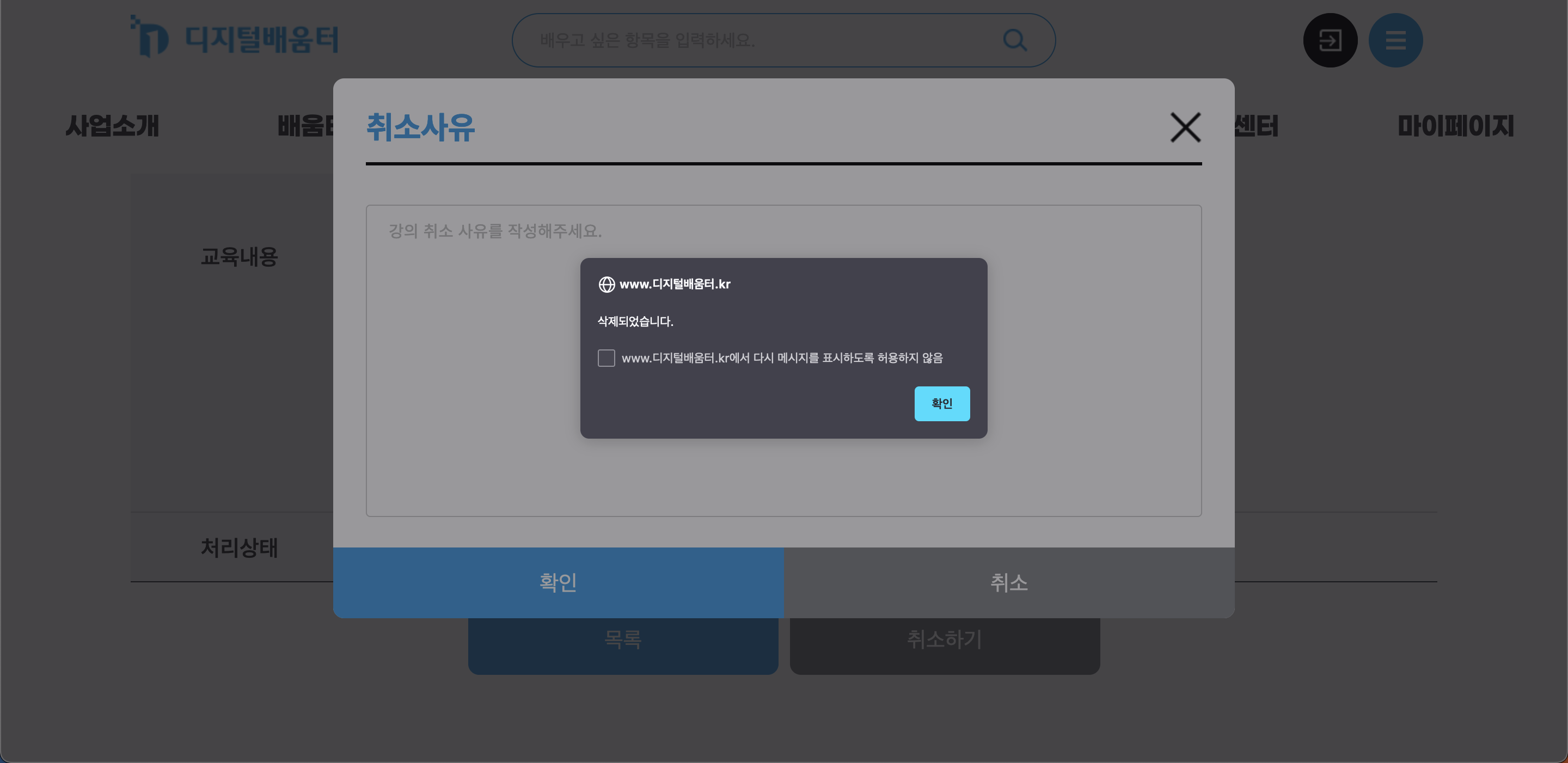 신청 취소 사유를 작성한 뒤 확인을 누르면 강의 신청이 취소되고 알림 톡을 받아볼 수 있다.